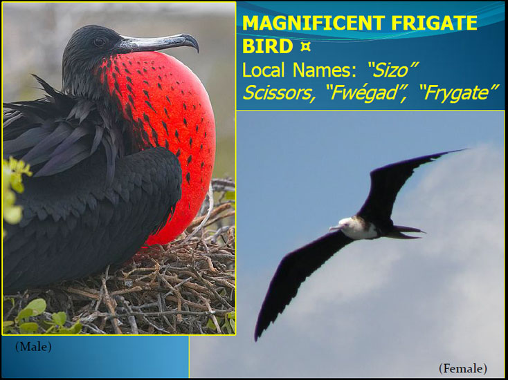 - Magnificent Frigate Bird – Local Names: “Sizo” Scissors, “Fwégad”, “Frygate”