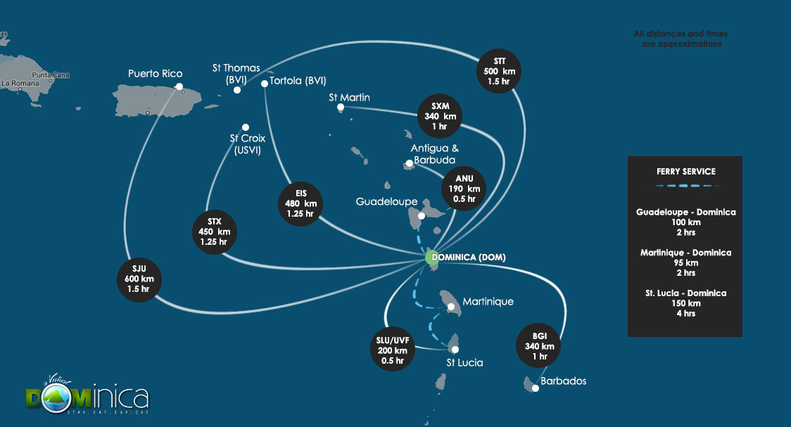 The neighbouring French islands are also convenient hubs for flights, especially from Europe to Dominica. They are also easily reached via ferry.Â